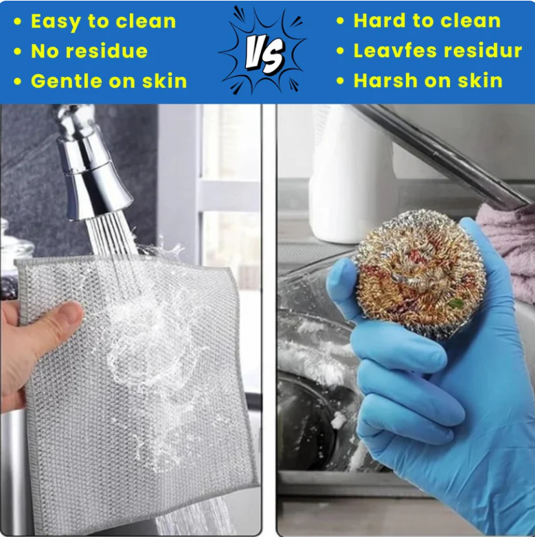 Our dishcloths are made from premium-grade stainless steel wire mesh, designed to be durable, rust-resistant, and safe for everyday kitchen use.